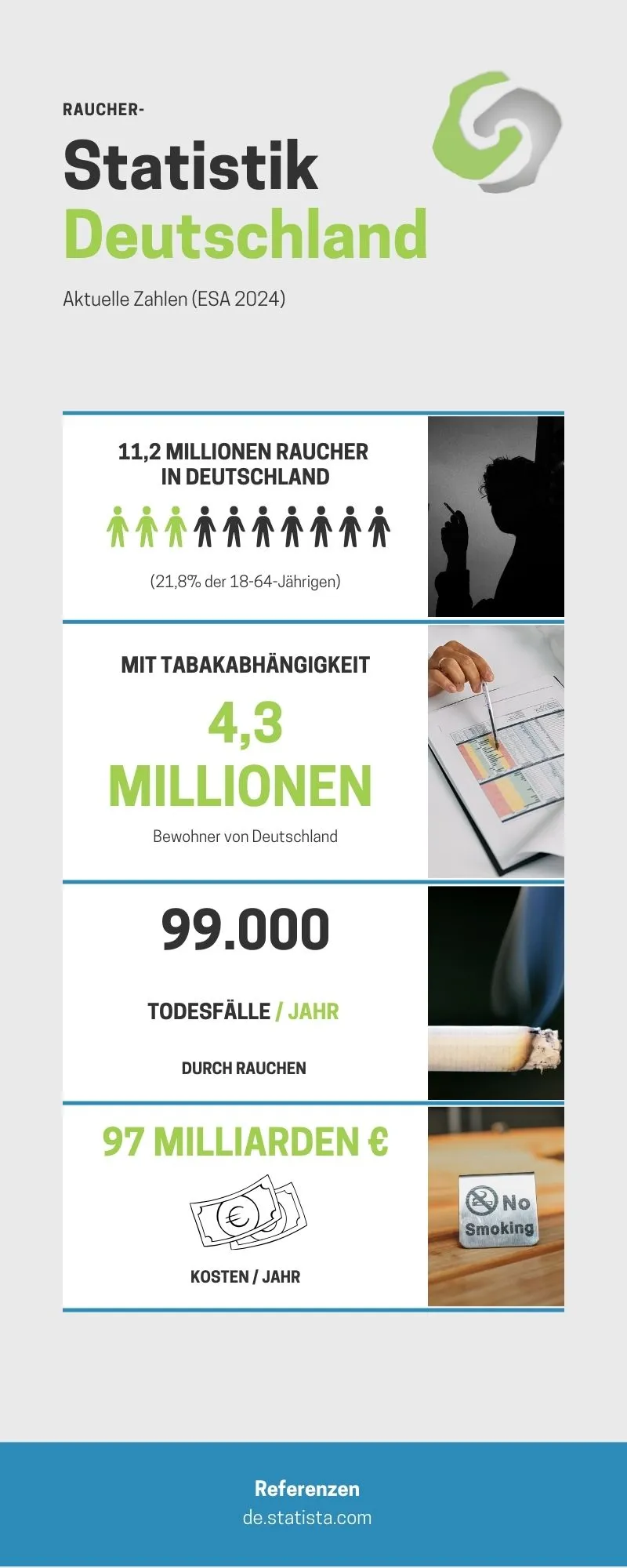 Vielleicht hast Du schon öfter versucht, mit dem Rauchen aufzuhören und Dich gefragt, warum es bis jetzt nicht geklappt hat. Der Grund, warum es so viele Raucher gibt (siehe Grafik „Raucher-Statistik Deutschland“, Anzahl der Raucher in Deutschland: 11,2 Mio.) und es so schwerfällt, mit dem Rauchen aufzuhören, ist die Abhängigkeit auf zwei Ebenen: der physischen und der psychischen Ebene.